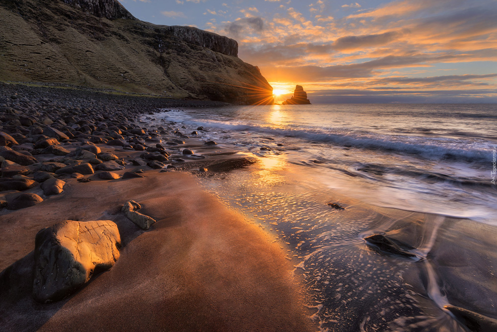 二ツ岩の脇からゆっくりと太陽が昇り、浜辺を朱に染めて、