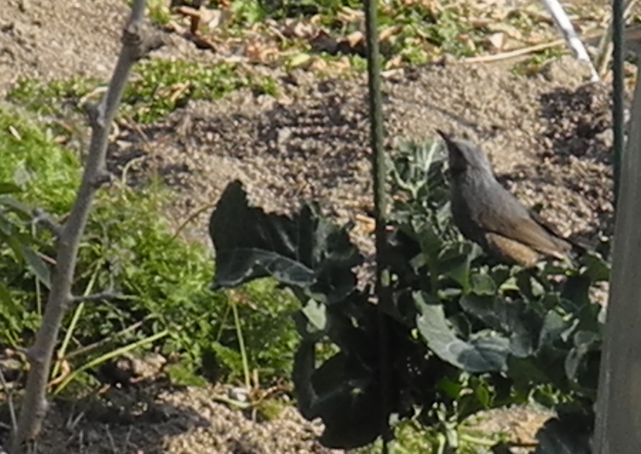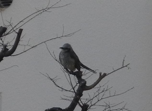 デジカメで撮って大きくして見たら、ヒヨドリの幼鳥? 若鳥でした。