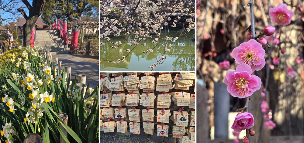 亀戸天神へ梅を見に、陽だまりの梅がほころび全体としてはまだ三分咲きほど、合格祈願の絵馬に託された願いが、境内を埋め尽くしていました、