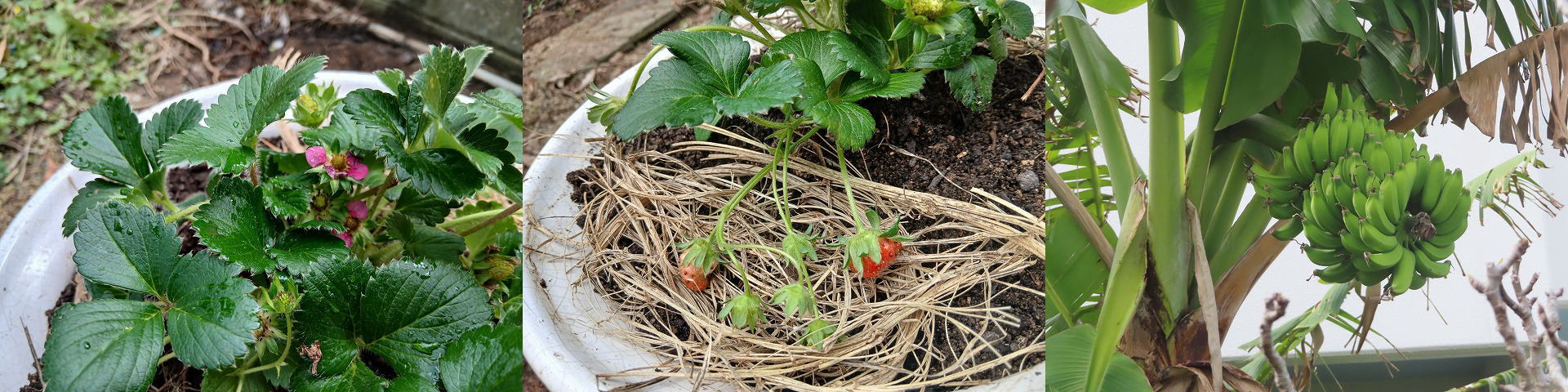 バナナは3本の木に実が着いています、生り物は楽しいですね。