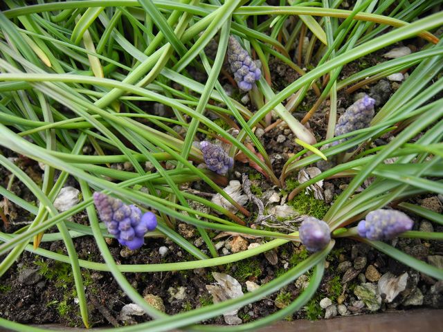 ムスカリ 葉っぱの間から蕾が見え始めました。