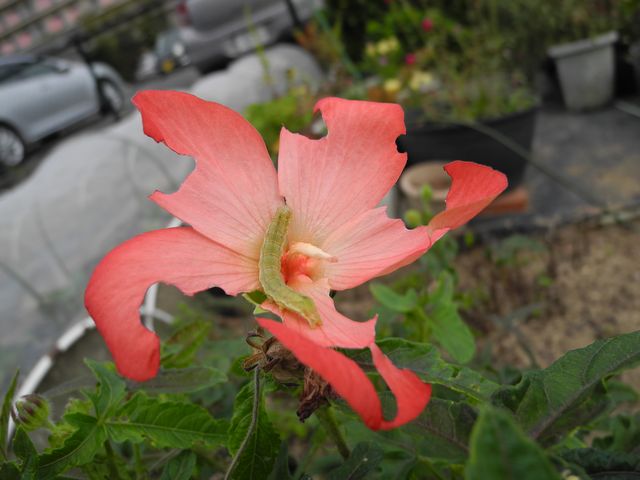 アカバナワタ(アジアンハイビスカス)に芋虫