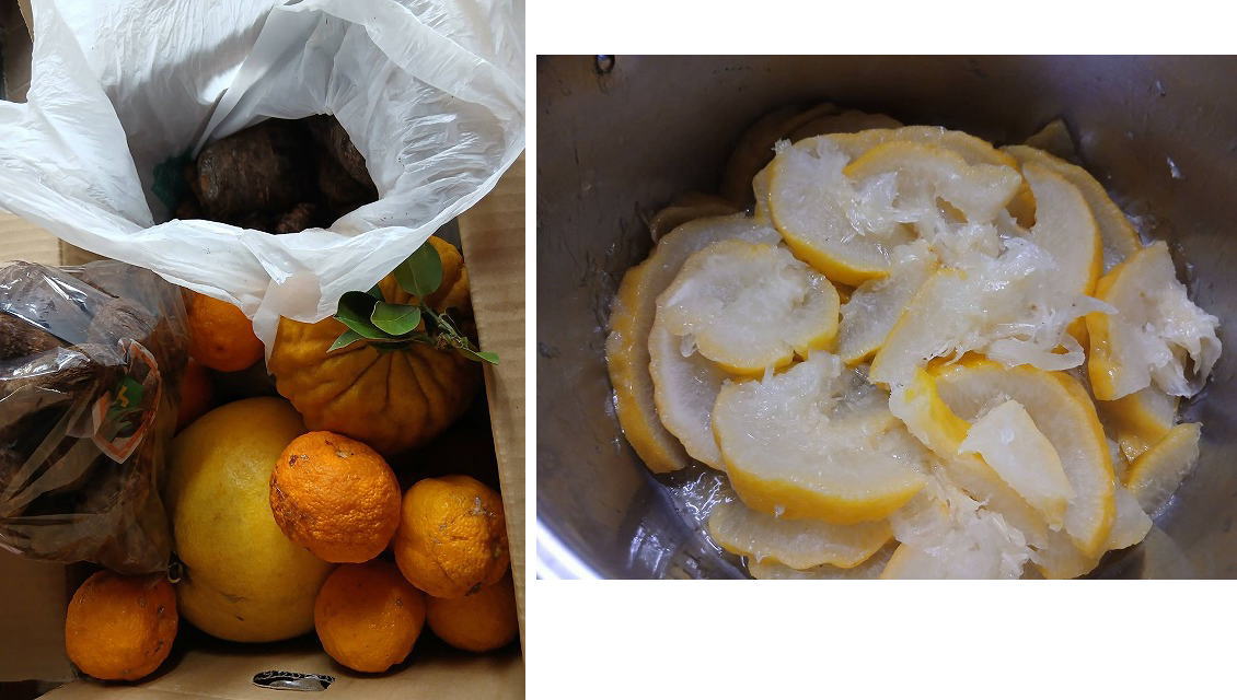 | 埼玉のお友達から里芋・ザボン・ユズのプレゼントです。 鬼ユズは砂糖で煮ると苦みが無くておやつで食べます。 今年の里芋は雨が降らなかったので出来が悪かったそうです。 | |