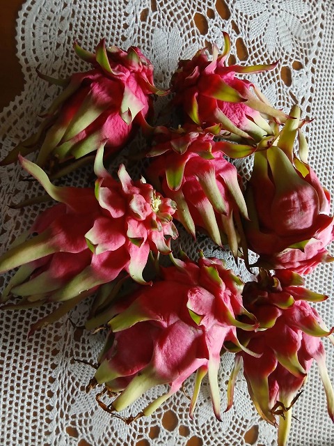 ドラゴンフルーツは実に栄養豊富でビタミンB1・B2、葉酸、ナイアシン、ビタミンC、カロチン等のビタミン類の他に、カリウム、マグネシウム、鉄等のミネラル類が豊富に含まれています。その他にも美容に嬉しい食物繊維や、老化防止に役立つポリフェノール、アントシアニン等の抗酸化物質も含有し、さらに解毒作用をもつアルブミンも入っています。