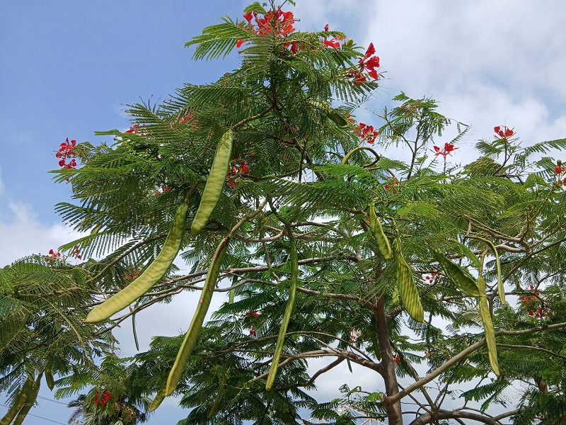 鮮やかな赤い花とシダのような葉、そして長く垂れ下がる種子のさやが特徴的です。