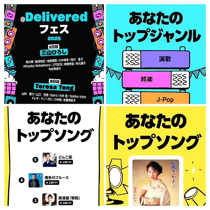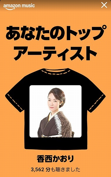 ◆今日、「Amazonミュージック」から案内があり、2025年1年間私が「Amazonミュージック」で聴いた曲のデータが記載されていました。 こんなことが「AI」の活用でデータ収集されるのですね! ※私かせ2025年の1年間で「Amazonミュージック」を聞いた延べ時間 17,338時間 ※最も聴いた歌手 香西かおり 3,562分 ※最も長い時間聞いた歌手の歌「香西かおり 雨酒場」308回再生 ※Amazonミュージックにおいて、「香西かおり」の曲「雨酒場」を再生した人の、再生回数は上位1%にランクイン! | |