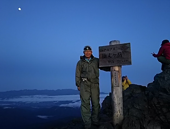 (AI「Sora-2」への「プロンプト) この登山は、日本の「仙丈ケ岳」(標高3033m)に約20年前に登録したときの静止画です。 これをベースに、夜明け前に山頂を目指して6,3.g、今(夜明け少し前に山頂到着)の後に、素晴らしいご来光が富士山の右肩から登るという動画を10秒で生成してください。 最後に山友4人で「バンザイ!」叫ぶシーンで終わります。