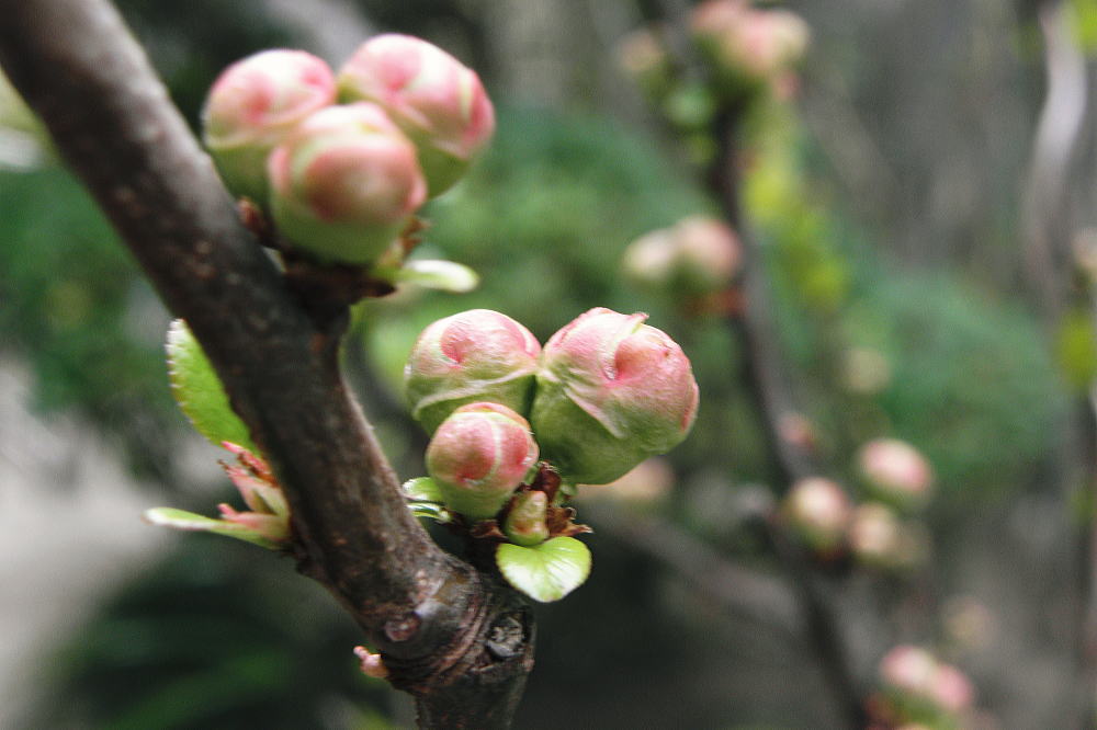 ボケの蕾が膨らんでわずかに先が赤くなってきて言います。
