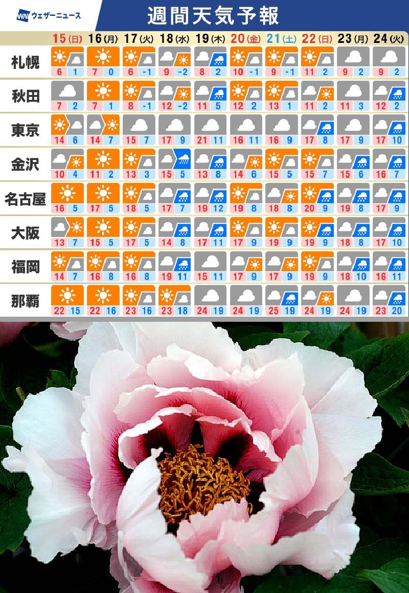 気温は上昇傾向で平年より高く、いよいよ桜が一気に咲き進むとの予想です。