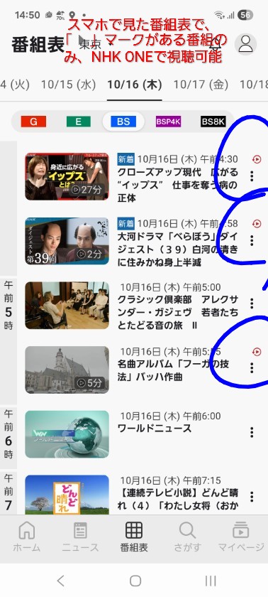 又、NHKの下記回答では、BS放送は、スマホでも「NHK ONE」で、見逃し配信番組など視聴が出来ないやの説明ですが、実際は一部番組かも知れませんが、私は見られました