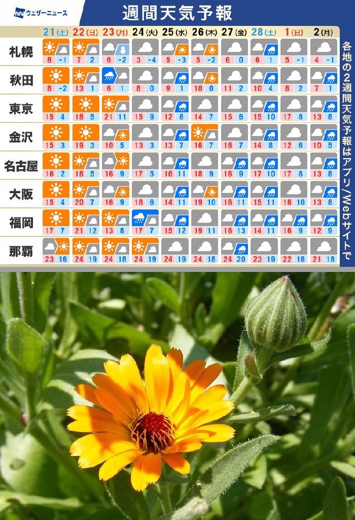 ただ、最終日の23日(月)は気温急変に注意が入ります。
