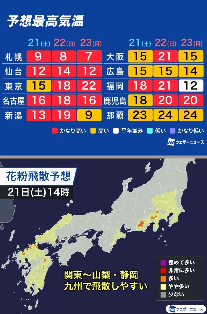 本日21日(土)からは三連休がスタートします。日本列島の上空には暖かな空気が流れ込み、
