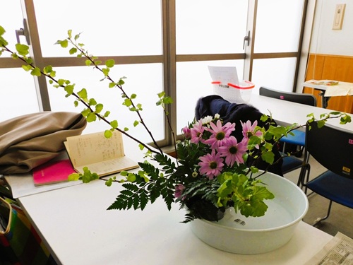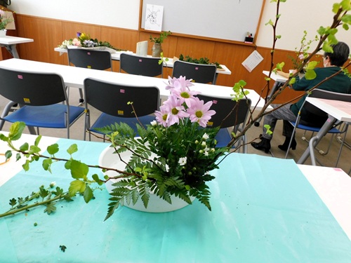 今朝の金沢は、バリバリに凍っていて高砂大学生け花教室へ 行くのに歩いて5分の電車駅までそろそろとゆっくり歩いて 行きました。早めに出て正解でした(^^♪ 梅の枝1輪でも800円はする中で、黄金こでまり、小菊、スプレーギク レザー・ファンで個性のある作品が出来ました。 草月とは違う流派ですが学びが多くて夢中です! | |